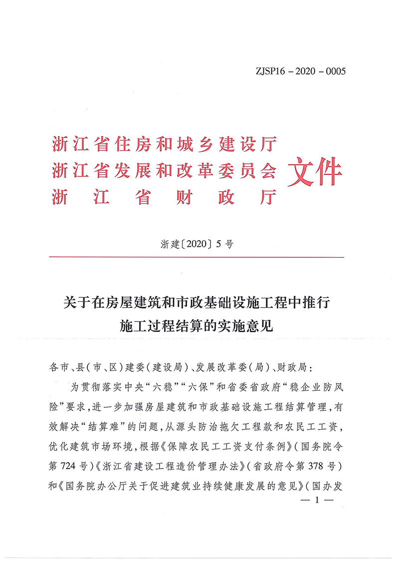為貫徹落實中央 “ 六穩”“ 六保” 和省委省政府"穩企業防風要求,進一步加強房屋建筑和市政基礎設施工程結算管理,有效解決 “結算難 " 的問題,從源頭防治拖欠工程款和農民工工資,優化建筑市場環境,根據《保障農民工工資支付條例》(國務院令第724號)《浙江省建設工程造價管理辦法》(省政府令第378號)和《國務院辦公廳關于促進建筑業持續健康發展的意見》(國辦發[2017] 19號)《浙江省人民政府辦公廳關于全面治理拖欠農民工工資問題的實施意見》(浙政辦發[2017]34號)等規定,現就我省房屋建筑和市政基礎設施工程中全面推行施工過程結算提出如下實施意見,請認真貫徹執行。